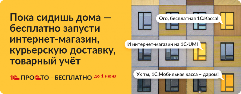 Чтобы помочь предпринимателям с наименьшими потерями пережить самый сложный период, фирма "1С" предлагает до 01 июня 2020 года бесплатно воспользоваться пакетом решений "1С-Просто", которые позволят в самые короткие сроки запустить интернет-магазин, организовать курьерскую доставку, дополнительные рабочие места кассиров и товарный учет в торговых точках.